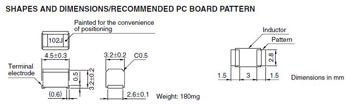 NL453232T-102J-PF features: (1)The product has good heat durability that withstands lead-free compatible reflow soldering conditions; (2)Lead-free material is used for the plating on the terminal; (3)The product uses metal terminals, which realize excellent connection reliability; (4)From 1μH to 1000μH, all of the products in the E-12 series are; (5)J(±5%) tolerance products; (6)It is a product conforming to RoHS directive.